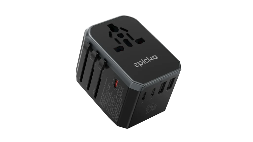 We like this adapter because it has plug types for anywhere in the world so we only need one adapter. It also has a USB-C and multiple USB-A plugs for charging multiple electronics at once.